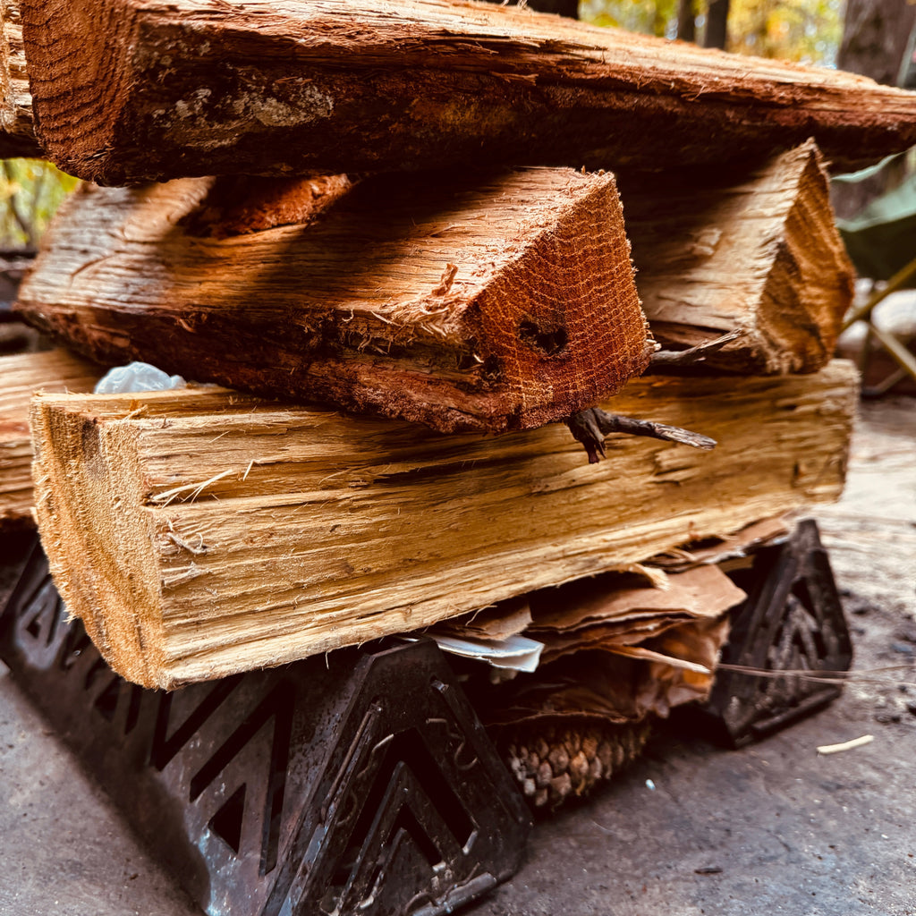 3) Lay the thickest firewood across the PyreLogs™ in a perpendicular pattern with a little space between each piece of wood (like setting up a game of Jenga®).